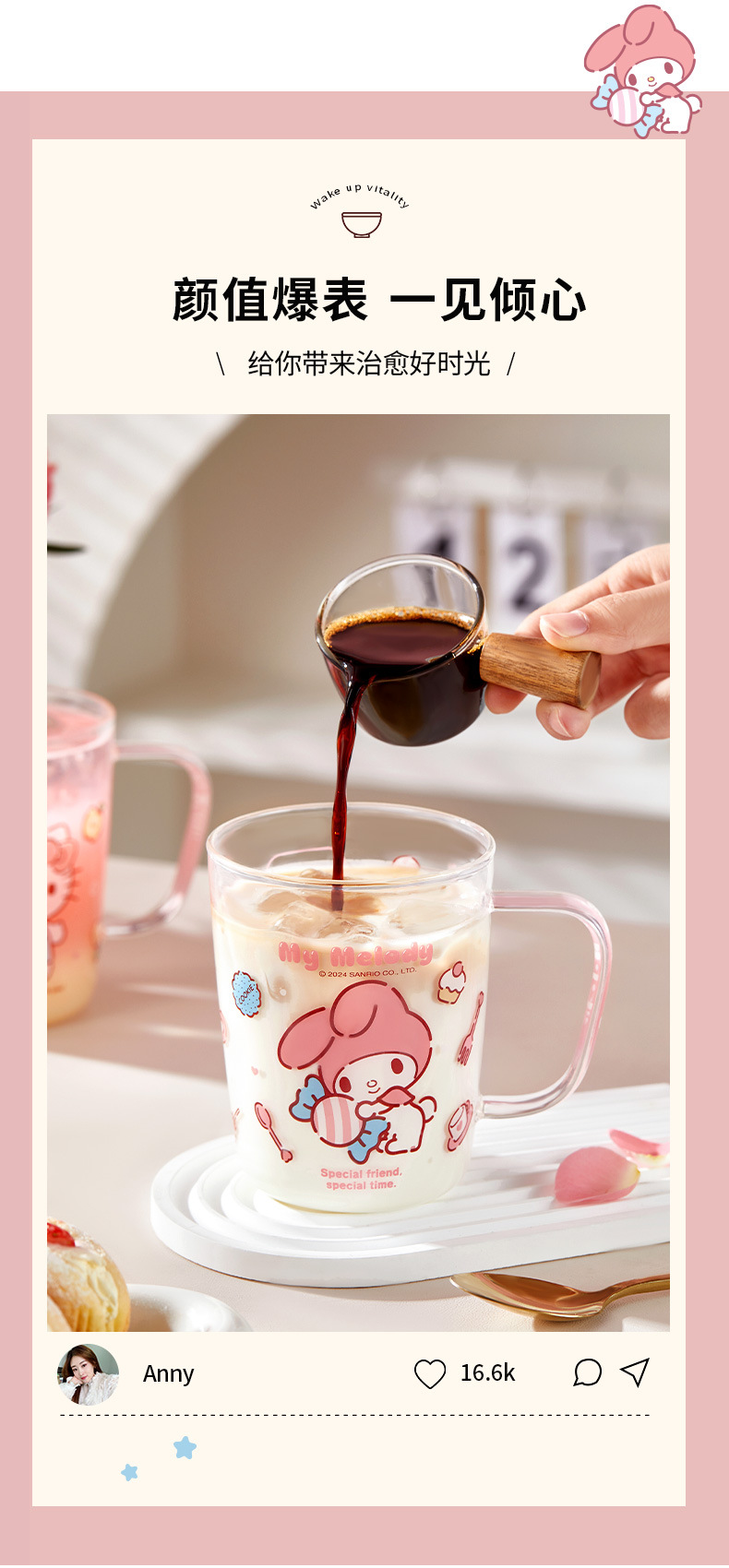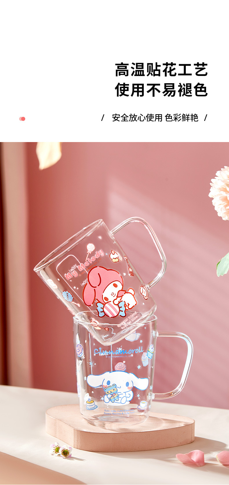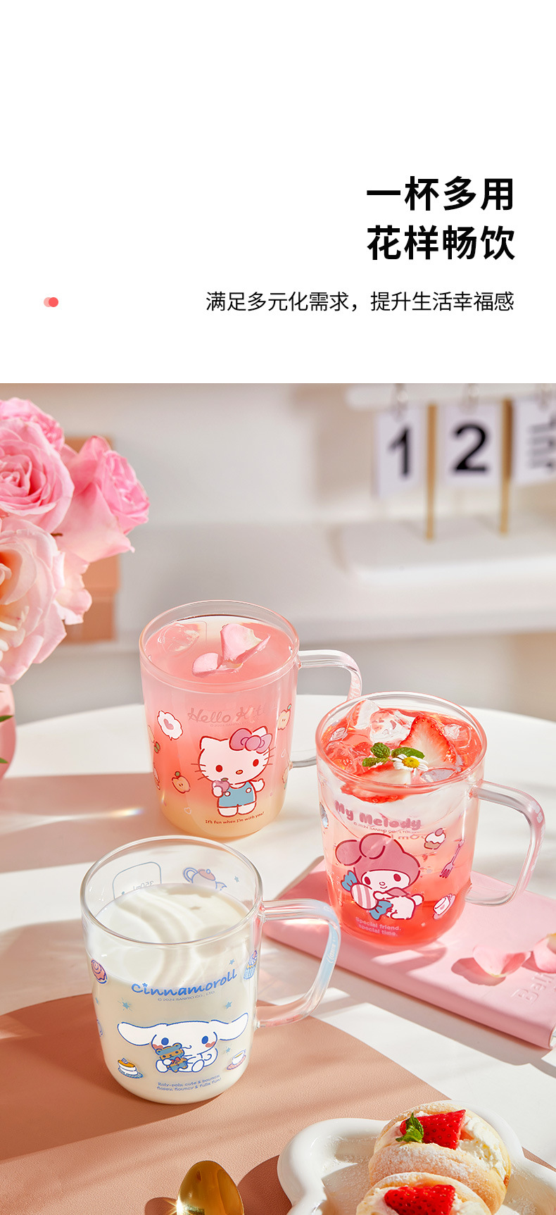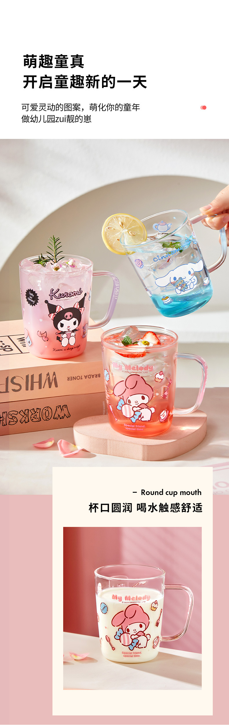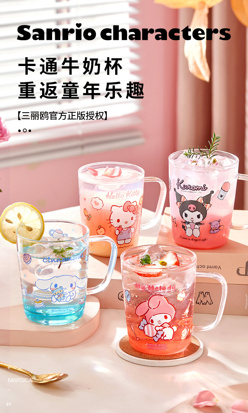 三丽鸥玻璃杯子耐高温水杯轻奢高级感家用高颜值喝水杯子刻度杯