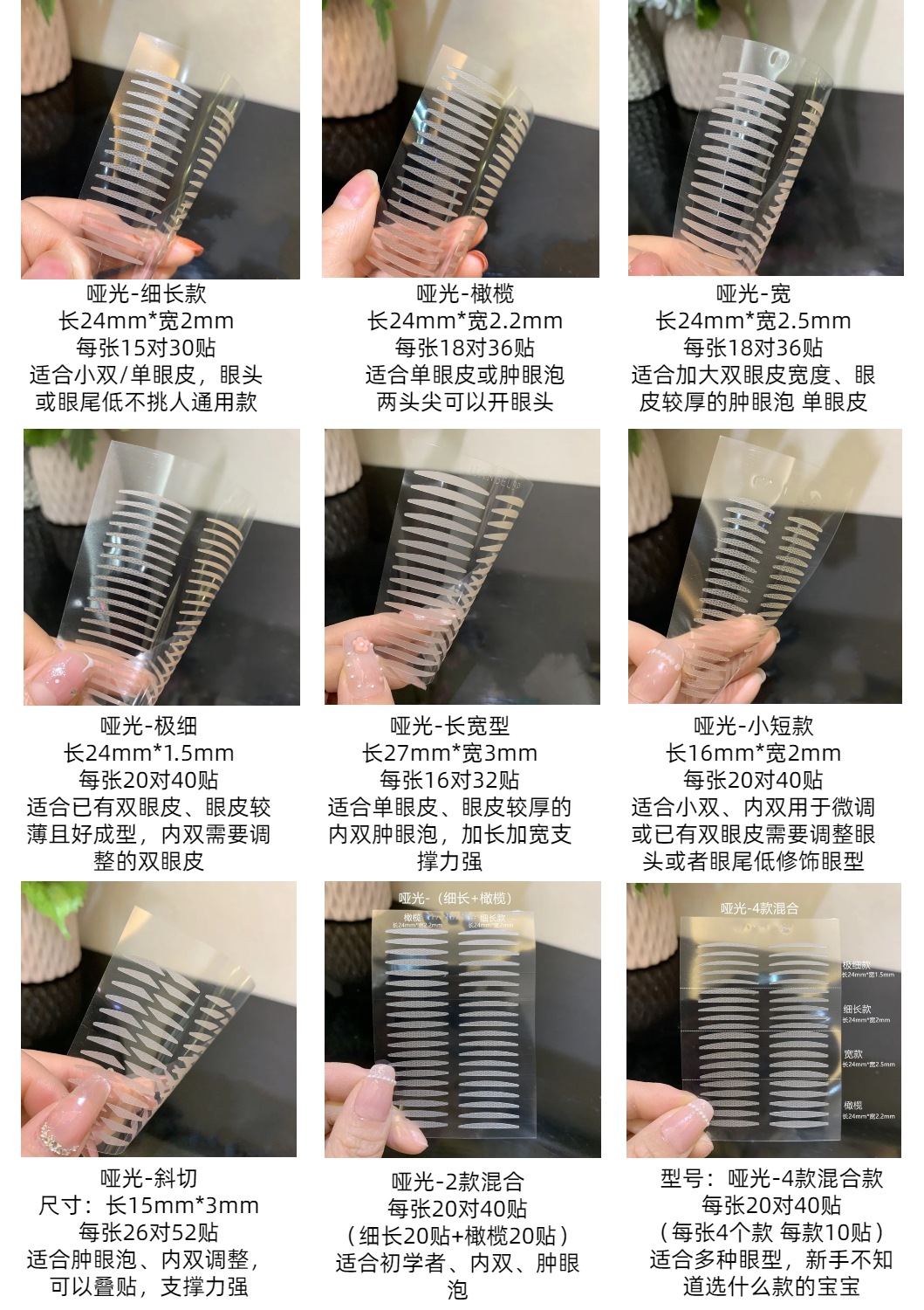 适合眼型:极细隐形款适合追求自然素颜的集美哟,越窄越隐形,相对的越窄的话支撑力会减弱,所以更适合眼皮薄且好成型的眼皮,内双或者想加宽双眼皮的宝宝们