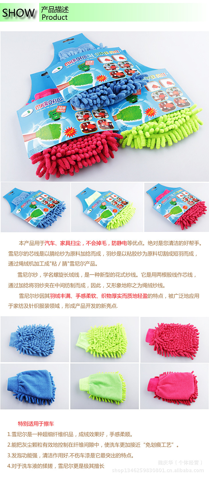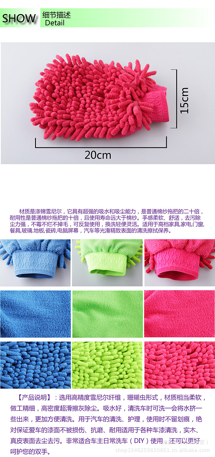本品选用高精度雪尼尔纤维,珊瑚虫形式,材质相当柔软,做工精细,高密度超滑擦灰除尘。中间为海绵,吸水好,清洗车时可洗一会将水挤一些出来,更加方便清洗。口部有一伸缩固定带,固定手掌,更加人性化!
