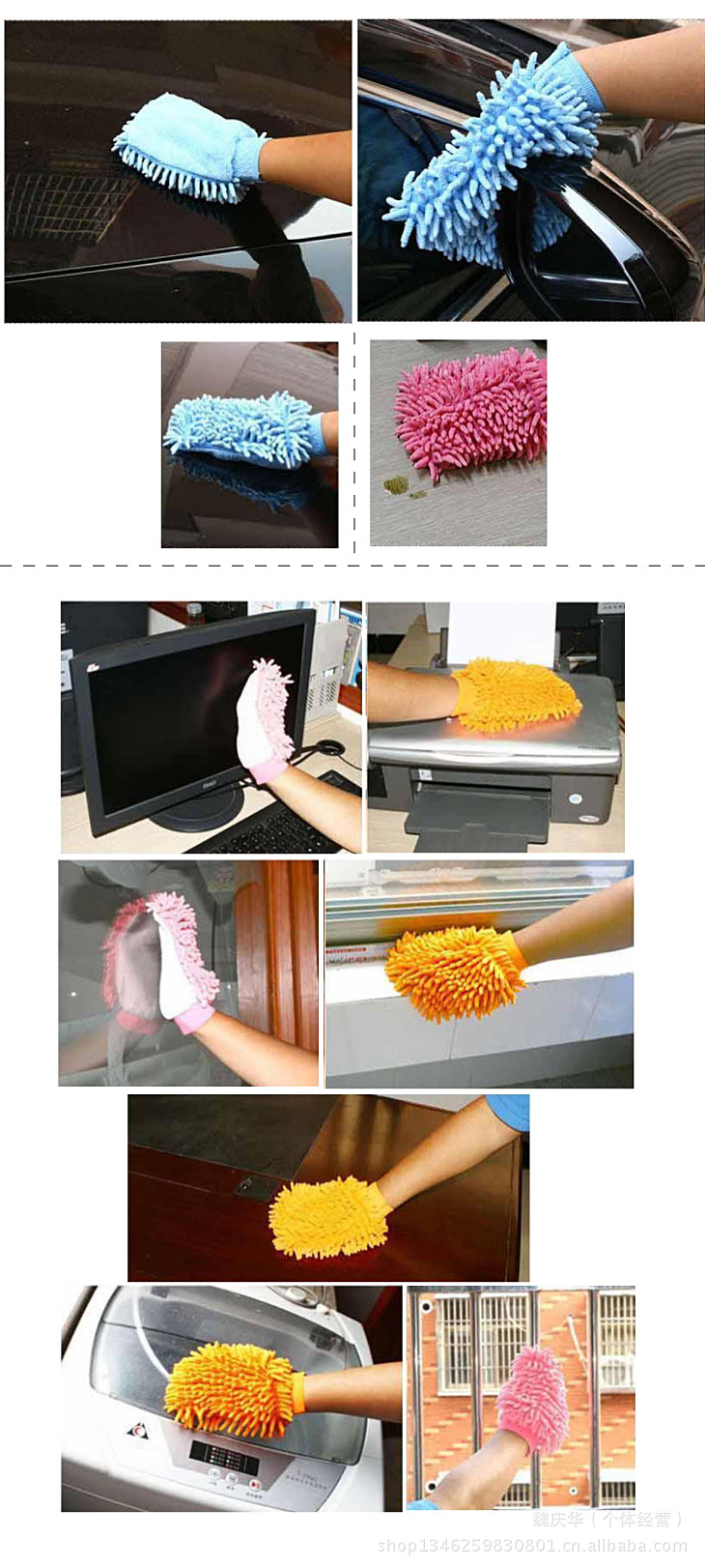 用于汽车的清洗、护理,使用时不留划痕,绝对保证爱车的漆面不被损伤。抗磨、耐用适用于各种车漆清洗,实木、真皮表面去尘去污。非常适合车主日常洗车(DIY)使用,还可以更好呵护您的双手。一面为雪尼尔,另一面为超细复合纤维毛巾质料,双面多用像手套一样使用,柔软、手感好、吸水性好、吸尘性好,适合擦洗汽车、家具等,所擦之物绝不受到磨损。 可以干擦去浮灰,可以湿擦,去灰效果非常好。并且容易清洗。爱车、家中的各式纱窗、不好擦的桌子隙缝、电风扇、有细缝的铁架铁柜、电脑主机风扇、键盘屏幕。清洁不伤玻璃,多种缤纷颜色。