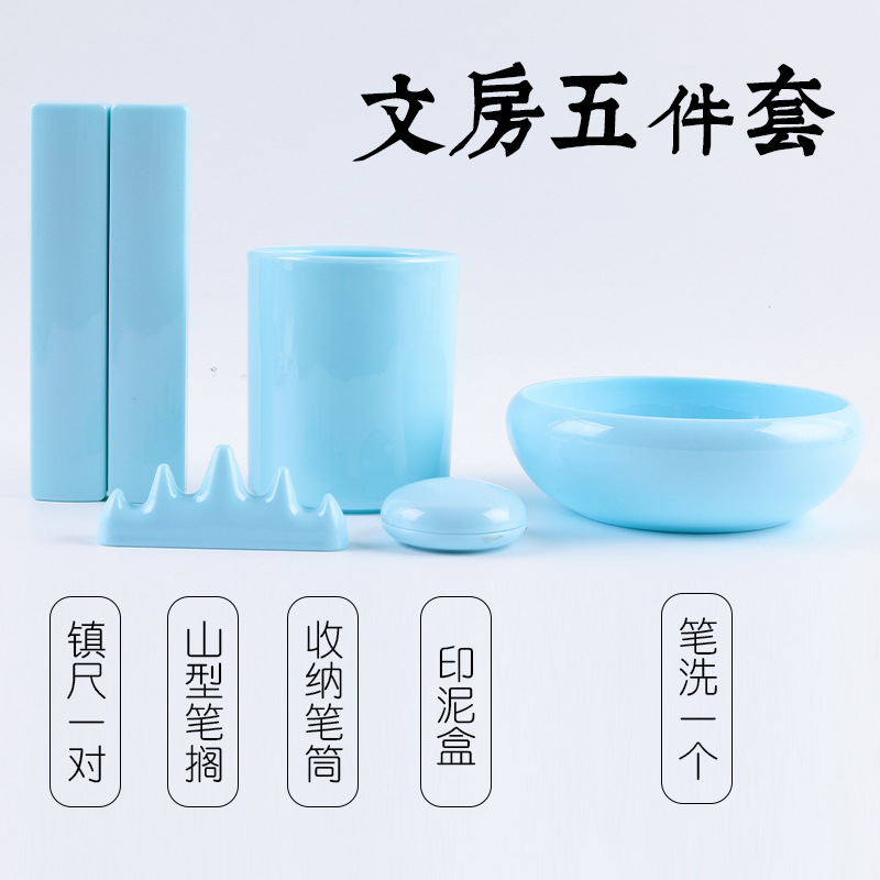 陶瓷塑料件仿玉镇尺水洗笔筒三指山墨碟印泥镇纸水碟毛笔小楷套装