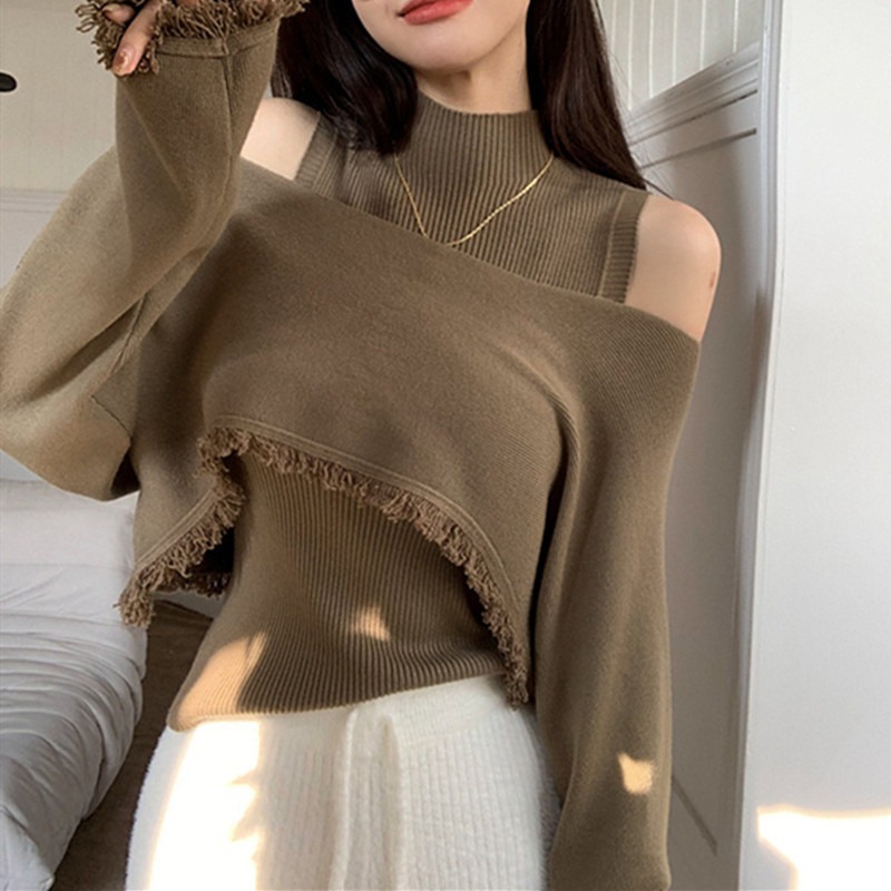 爆款秋冬款名媛蕾丝肩毛衣女上衣气质修身针织衫女针织套头上衣