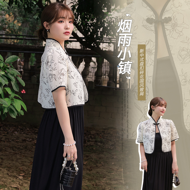 新中式国风短袖罩衫女夏季胖mm大码古典撞色外搭碎花小开衫62648