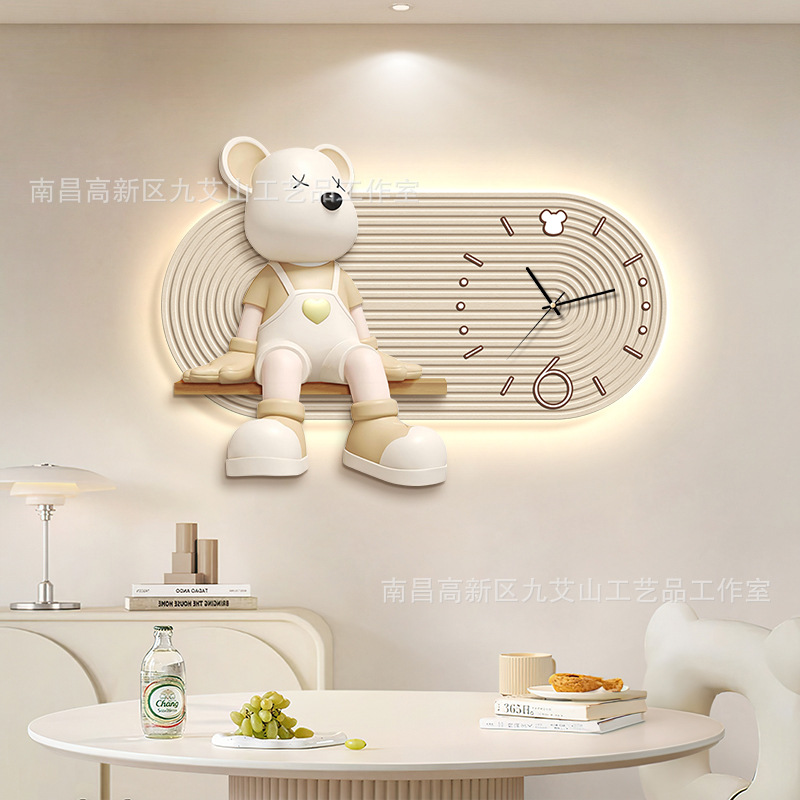 奶油风餐厅装饰画带时钟表暴力熊卡通饭厅背景墙挂画创意客厅壁画