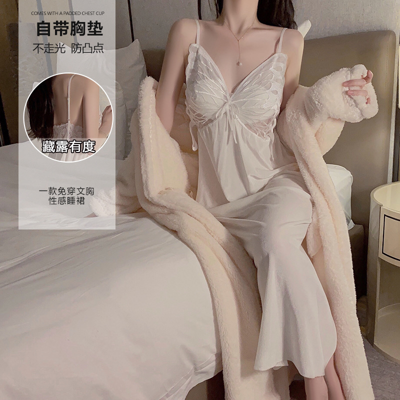 V领性感吊带睡裙纯欲诱惑收腰两件套春夏季薄冰丝睡衣女长袖睡袍